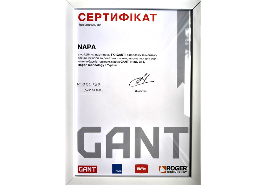 Компанія NAPA є офіційним партнером ТОВ “ГАНТ-ЮА” з продажу та монтажу секційних воріт та ролетних систем, автоматики для воріт та шлагбаумів в Україні. Також NAPA є офіційним дистриб’ютором BFT, NICE S.p.A. та Roger Technology S.r.L. в Україні.